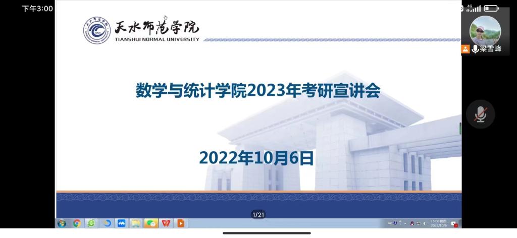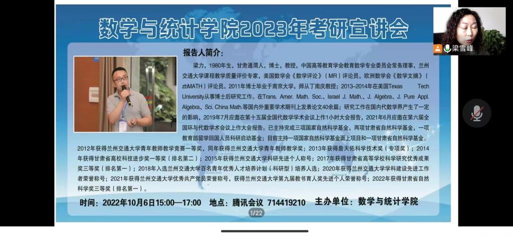 10月6日下午,数学与统计学院邀请兰州交通大学数理学院副院长梁力教授通过腾讯会议作了考研专题宣讲,学院领导班子、2019级考研学生及2020级有考研意向学生共100余人参加,会议由学院分管教学工作领导主持。