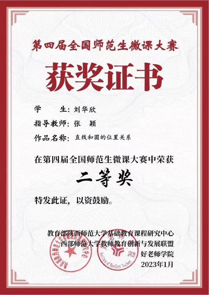 2023年1月4日,由教育部陕西师范大学基础教育课程研究中心、西部师范大学教师教育创新与发展联盟共同举办第四届全国师范生微课大赛获奖结果揭晓。数学与统计书院2022级学科教学(数学)研究生刘华欣“直线和圆的位置关系” 荣获数学组二等奖。