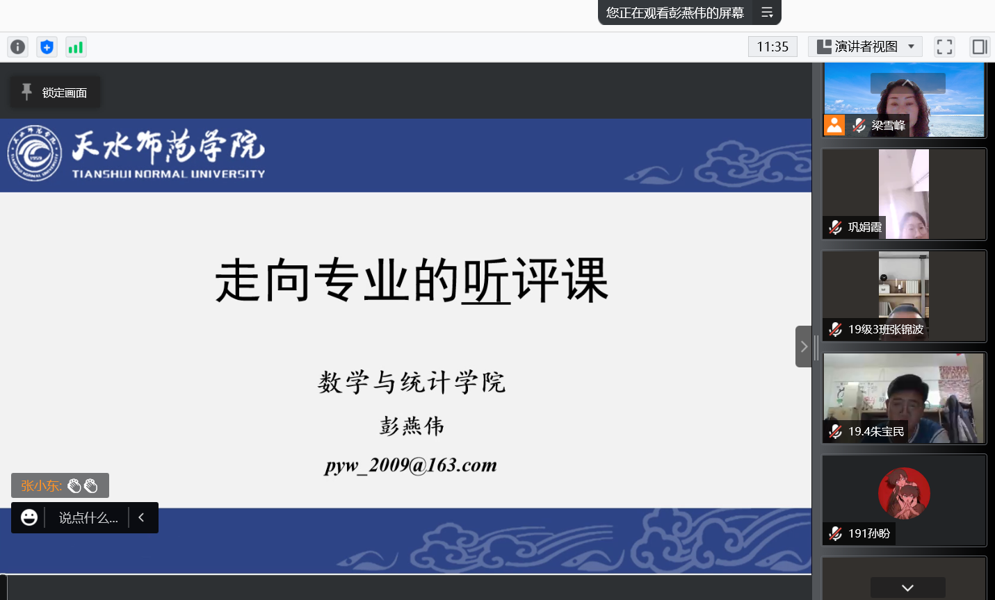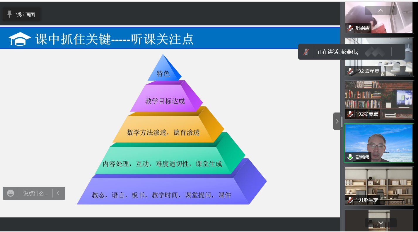 2021年12月5日晚7:30,数学与统计学院彭燕伟博士通过腾讯会议作了题为《走向专业的听评课》报告。19级师范生及部分学科教学(数学)硕士共210余人参加,报告由学院分管教学领导主持。