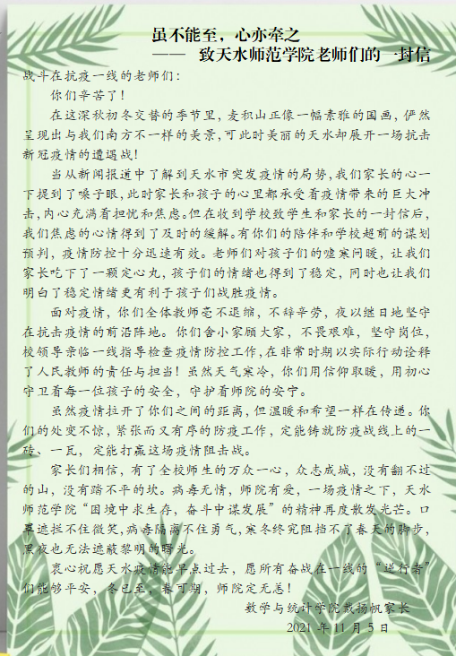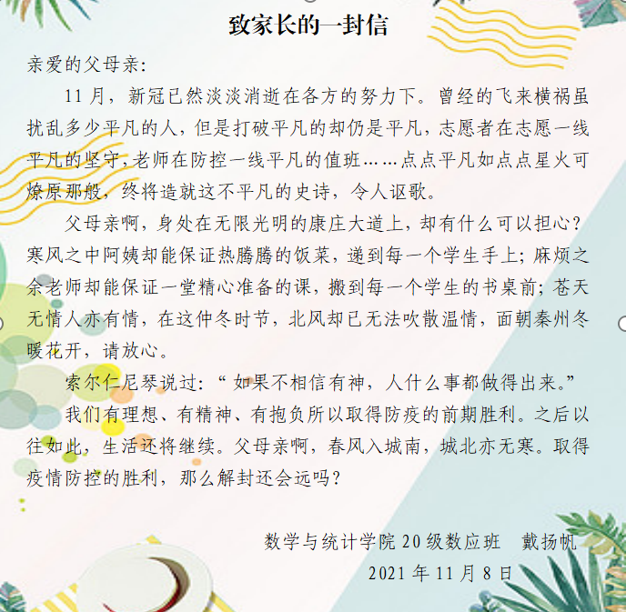 2021年10月22日凌晨,博学公寓因疫情紧急封闭,被封闭在公寓楼的就有数学与统计学院戴扬帆同学在内的278名男生,不够宽阔的空间,不同的生活习惯,来自对疫情的焦虑……。学校最担心的是学生不配合、家长不理解,就在我们想法设法的疏导学生焦虑情绪,与家长沟通协调之时,分别来自戴扬帆家长和学生本人的一封信,瞬间让我们感觉所有的努力和付出都得到了回报。