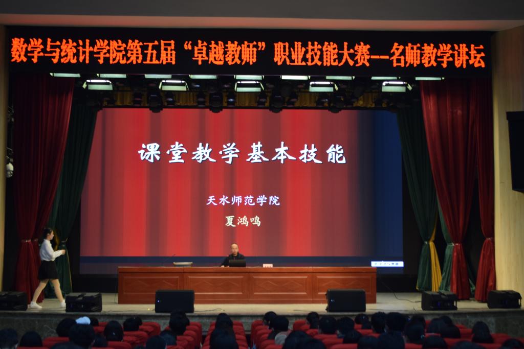 2020年11月12日晚,数学与统计学院第五届“卓越教师”职业技能大赛第一环节活动——名师教学讲坛在学校大礼堂开展,学院夏鸿鸣教授以《课堂教学基本技能》为主题为现场600余名学生作了专题讲座。