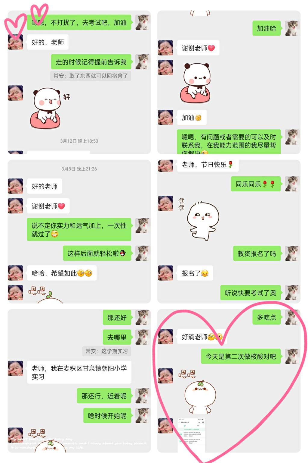 此次学校疫情防控封闭管理以来,张苗苗吸取去年的防疫成功经验,早做打算早谋划,精准统计数据、精确摸排学生轨迹、和学生做朋友、化解学生矛盾,工作做到有条不紊。“各位班主任早上好,请提醒全体学生随时关注个人健康码、行程码,如有异常,请第一时间告知我”每个清晨伴随着这句话,张苗苗开启了紧张忙碌的一天。这句话一天要重复好几次,不断的重复是为了摸清学院学生疫情期间的所有可能情况,不断地重复是为了及时引导学生健康乐观应对疫情,不断地重复是为了建立好疫情防控屏障。