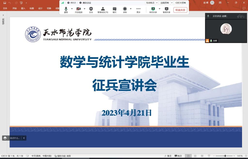 “携笔从戎 无上光荣”,为激发学院学生报效祖国、应征入伍的热情,帮助大学生了解、掌握应征入伍相关政策,营造应征光荣的浓厚氛围。2023年4月21日,数学与统计学院举办了2023年下半年大学生应征入伍政策解读宣讲会。宣讲会通过线上线下相结合的方式召开,会议由学院分管征兵工作的辅导员赵媛老师主持,学院26个班级的班长、团支书、大数据专业学生及学院有应征入伍意愿的学生参加了会议。