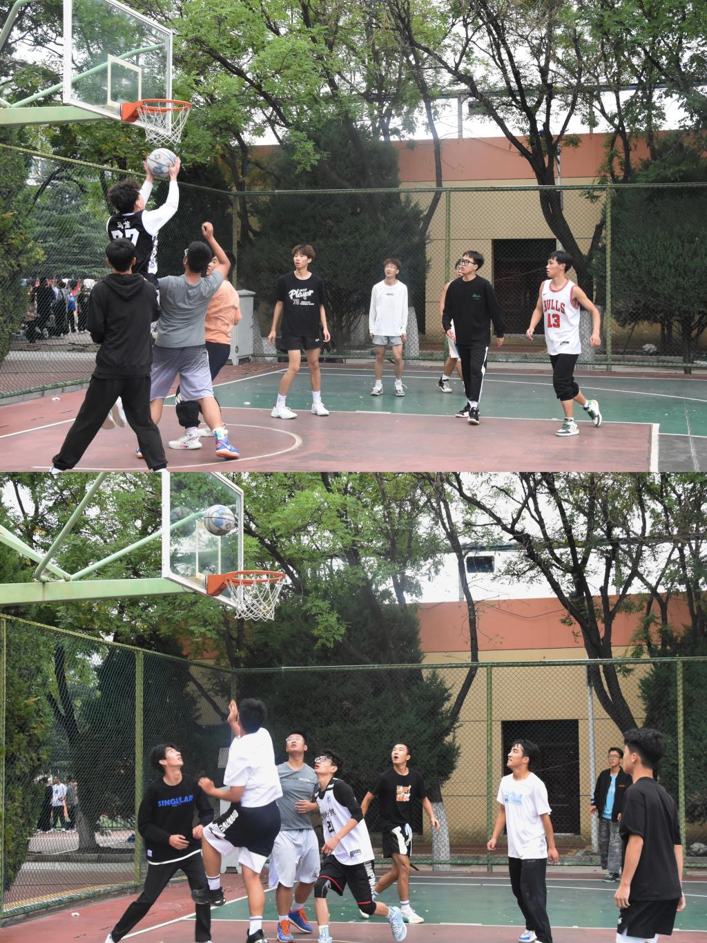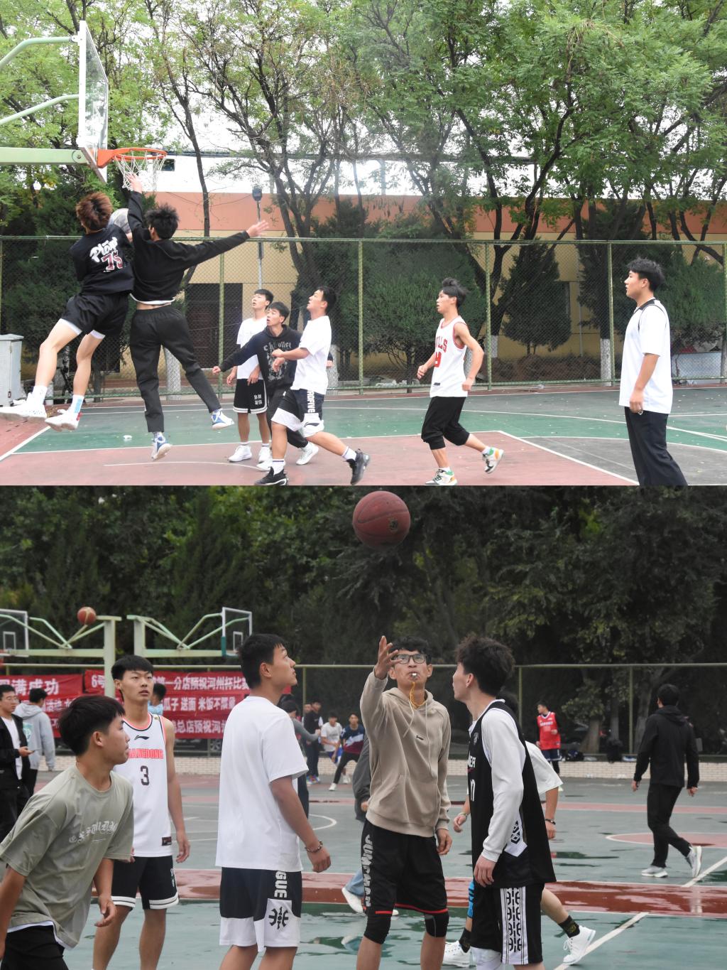 随着哨声的吹起,球员们聚精会神,尽情地享受比赛,放肆地挥洒汗水,快速地调整步伐,积极防守,快速上篮,开心地感受青春的美好时光。比赛中,球员们默契配合,越战越勇,在场同学也热情高涨,呐喊加油,气氛紧张热烈!