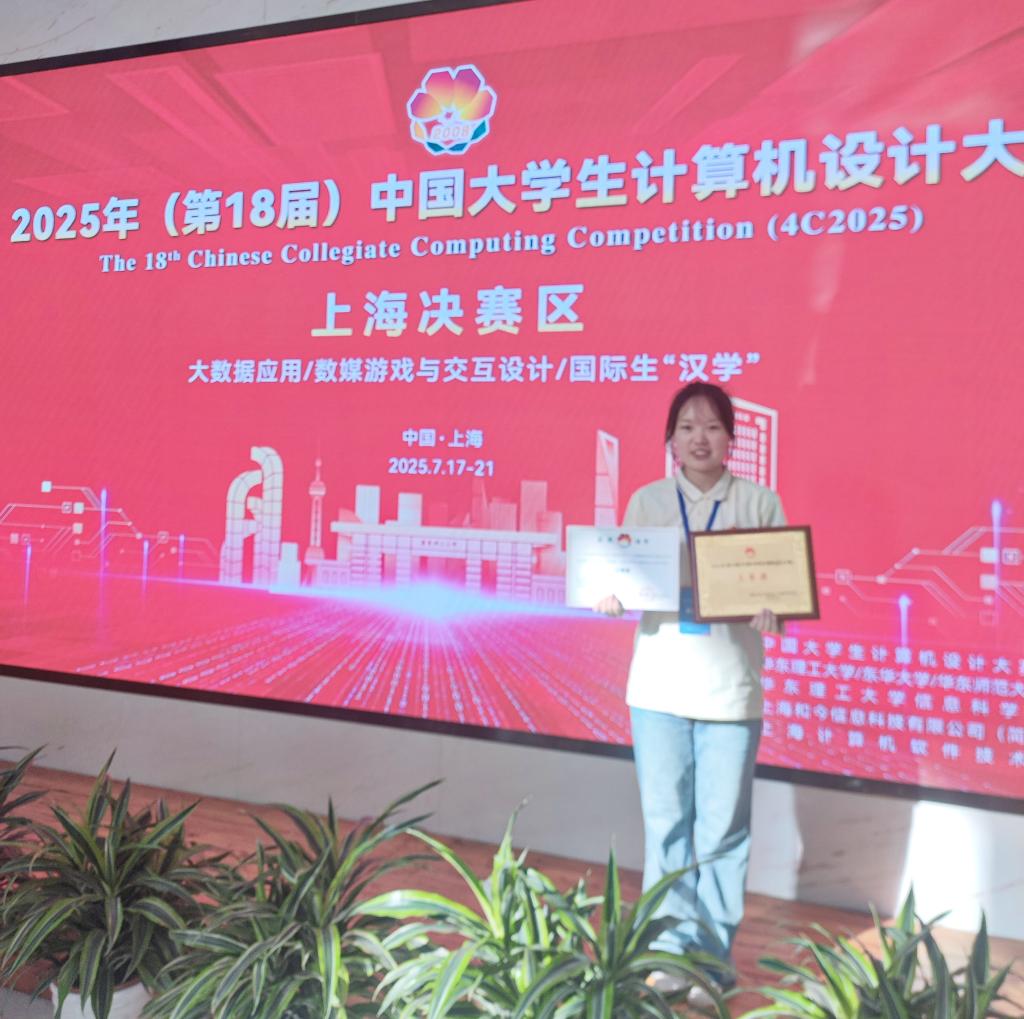 7月21日,2025年(第18届)中国大学生计算机设计大赛全国总决赛在上海华东理工大学圆满举行,本次赛事吸引全国500余支队伍同台竞技,经过紧张激烈的角逐,数学与统计学院刘倩茹和机电与汽车工程学院林欣2名同学组成的团队,凭借作品《数览天水—大数据驱动的古城沉浸式导览系统》脱颖而出。在决赛现场,刘倩茹同学代表团队进行项目路演与答辩,通过出色的视觉呈现、清晰的方案阐述与自信的答辩互动,全面展示了该作品的创新价值与社会效益,在大数据应用赛道中荣获全国三等奖。