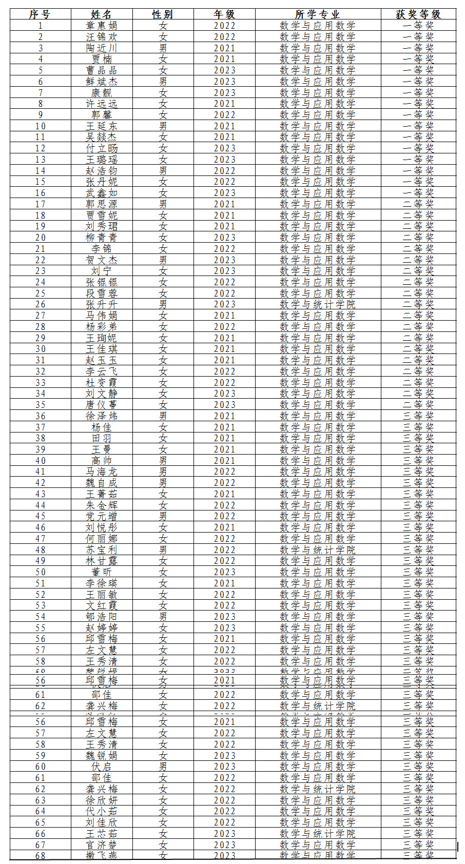 近年来,数学与统计学院在学校教务处大力支持和组织协调下,积极开展大学生数学竞赛和数学建模竞赛等学科竞赛。从竞赛报名、预赛筛选到培训和辅导的各个环节都精心组织。优异的成绩既体现了学生个人的数学能力,也体现了学校良好的教学水平和人才培养模式的优势。